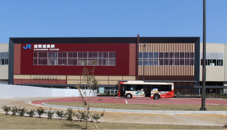 駅周辺は白山や江沼三山の山並み、穏やかな丘陵地帯との景観調和を図り、100年後も地域に愛され続ける駅となることを目指して建設されました。花と緑を活用した空間づくりにより、山代・片山津・山中の三温泉を結ぶシンボル的な交流拠点としての役割も担っています。